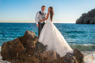 En la playa hay tres elementos principales con los que interactuar en un reportaje de postboda, uno es la arena, otro son las rocas y otro el agua. Este último elemento da más juego en verano dándote la oportunidad de jugar con el agua, mojar el vestido y el traje de los novios, nadar, acceder por el agua a otras ubicaciones….