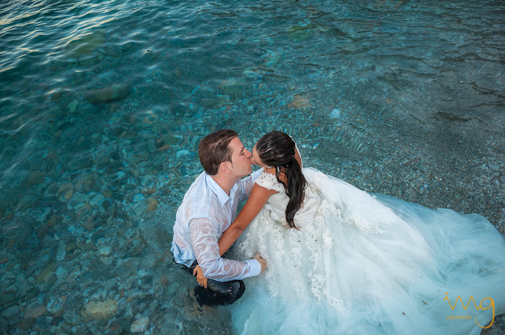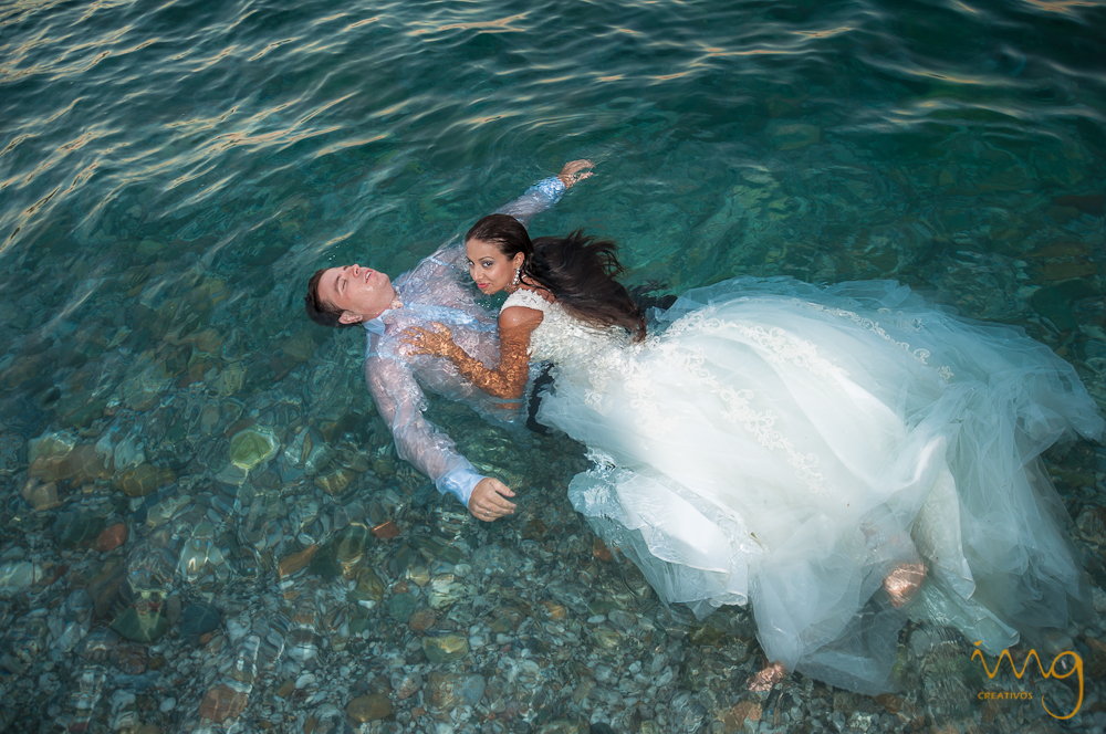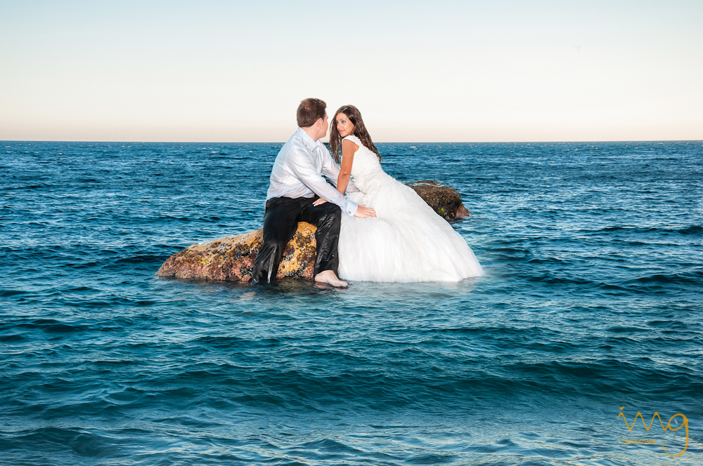 En la playa hay tres elementos principales con los que interactuar en un reportaje de postboda, uno es la arena, otro son las rocas y otro el agua. Este último elemento da más juego en verano dándote la oportunidad de jugar con el agua, mojar el vestido y el traje de los novios, nadar, acceder por el agua a otras ubicaciones….