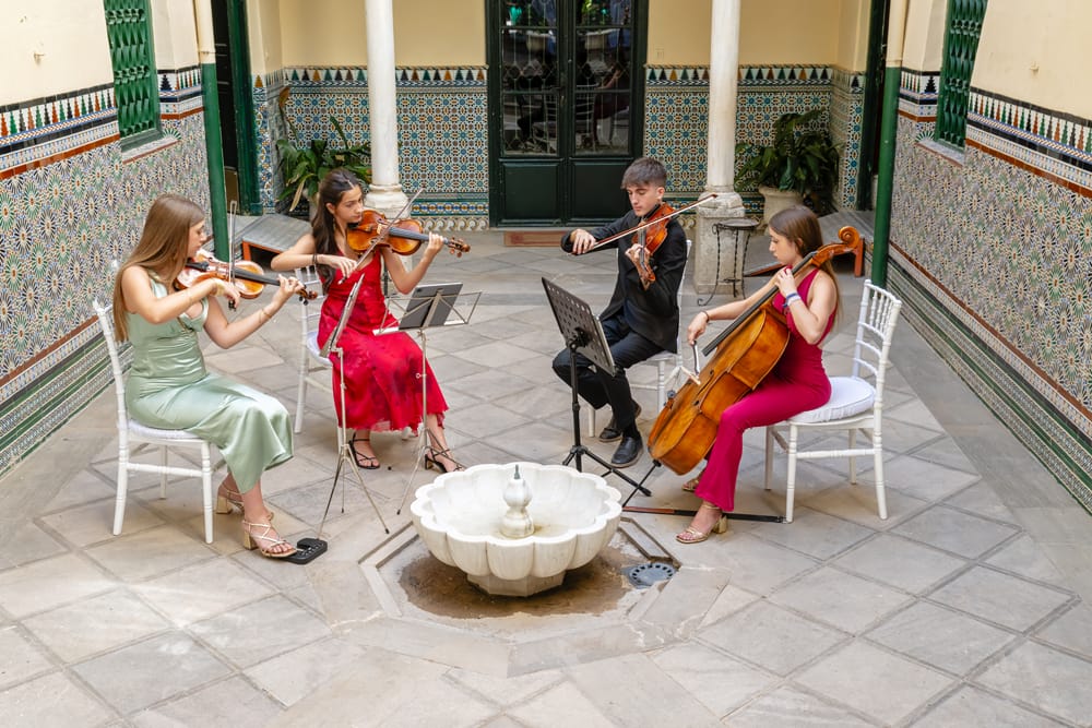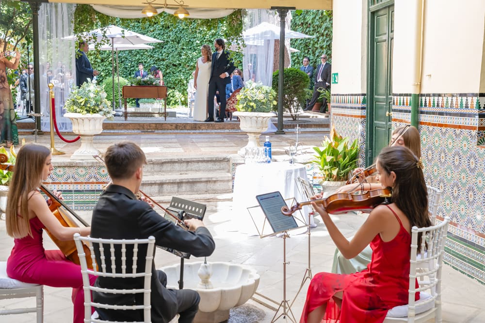 Para hacer este día aún más especial, una de las parejas optó por música en vivo. Un cuarteto de cuerda en uno de los patios interiores, con la belleza de los azulejos de fondo, añade una banda sonora inolvidable. En IMG Creativos recomendamos encarecidamente la música en directo para sumar emoción a vuestro reportaje de fotografía de boda.