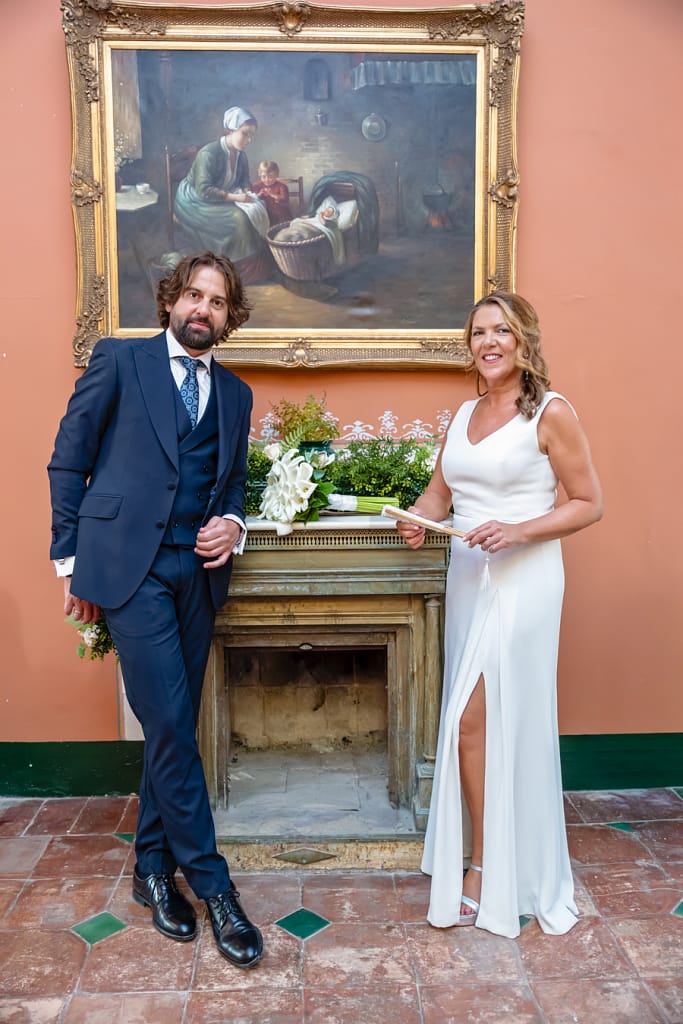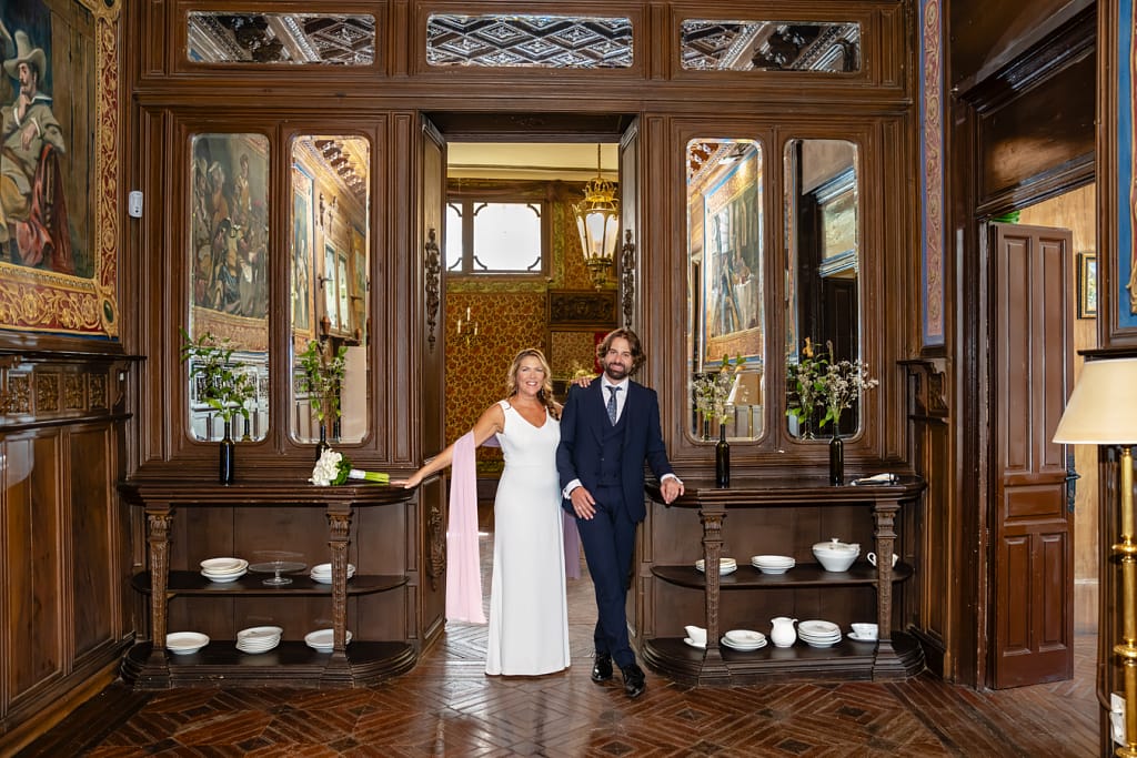 Las salas con artesonados de madera y grandes cuadros, como vemos en una de las fotos de los novios, aportan un toque clásico y distinguido. Estos ambientes interiores son perfectos para unas fotos de pareja con un aire de lujo y tradición.