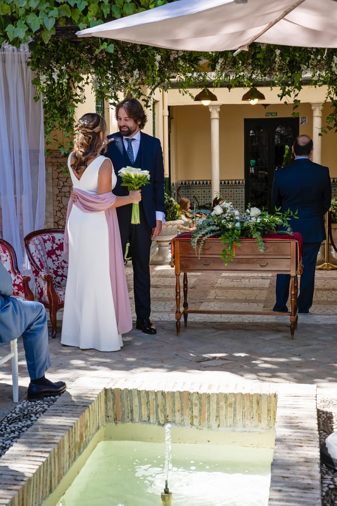 Los patios interiores, con su encanto atemporal, son ideales para una ceremonia civil íntima. Míralos: la vegetación frondosa y la fuente central ofrecen un fondo natural y elegante a los novios.