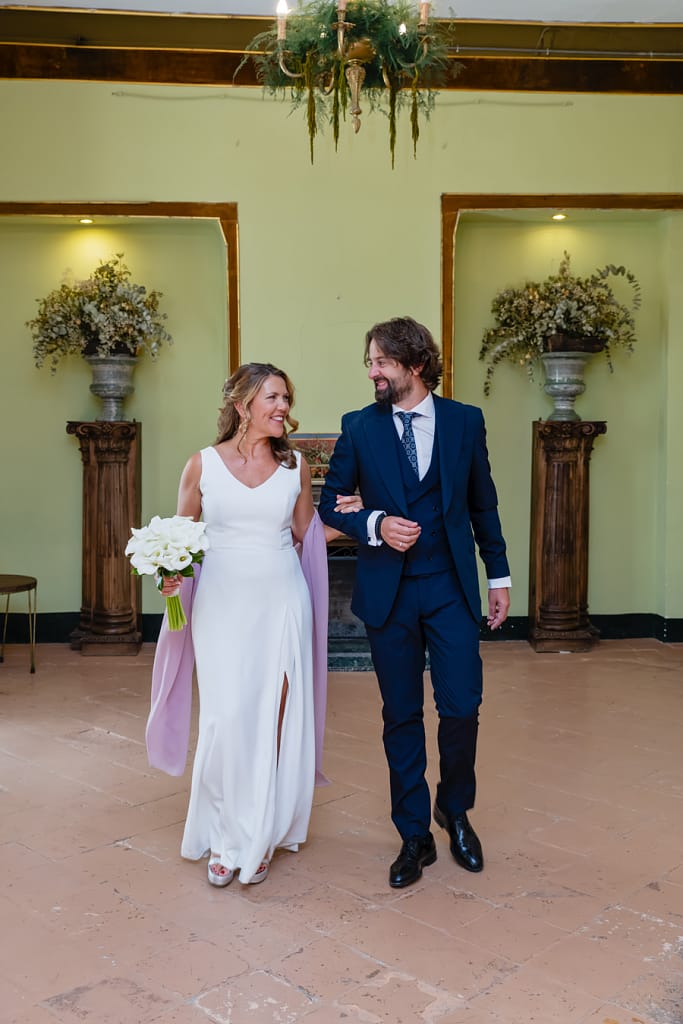 La belleza de celebrar una boda en un palacete como este radica en la versatilidad de sus espacios. Las imágenes nos muestran la emotiva ceremonia civil bajo pérgolas naturales.