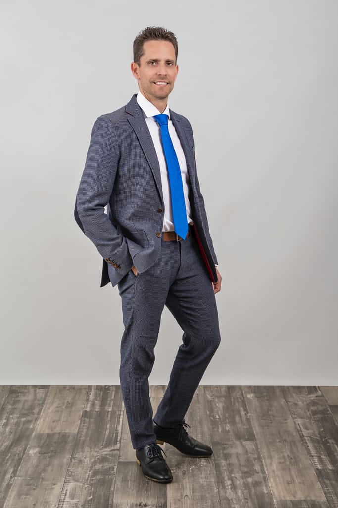 A veces, es necesario mostrar la imagen completa. Un retrato de cuerpo entero nos permite apreciar el estilo personal y la presencia del profesional. En esta última fotografía, el sujeto viste un elegante traje azul con textura. La pose es natural y sofisticada, con una mano en el bolsillo, transmitiendo seguridad y aplomo. El fondo gris claro y el suelo de madera aportan calidez y un toque moderno. Este tipo de plano es muy versátil para catálogos, ponencias o para mostrar el código de vestimenta de la empresa.