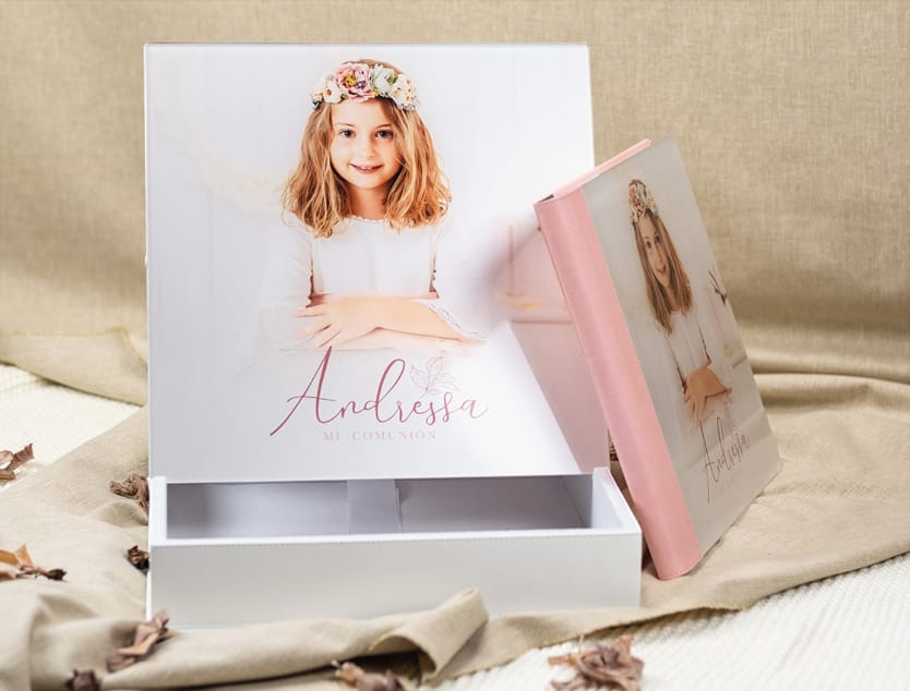 Todos los complementos que necesitas para tu reportaje de Comunión. Álbumes, recordatorios, regalos, libro de firmas y más.